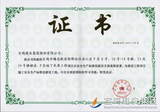 2017年11月23日,從中國(guó)建筑業(yè)協(xié)會(huì)建筑安全分會(huì)獲悉,由我公司八項(xiàng)目部承建的寶雞市蟠龍新居保障性住房小區(qū)F區(qū)8號(hào)、10號(hào)—14號(hào)樓、13及14號(hào)樓裙房、F區(qū)地下車(chē)庫(kù)工程在安全生產(chǎn)標(biāo)準(zhǔn)化建設(shè)方面成效顯著,被評(píng)選為建設(shè)工程項(xiàng)目施工安全生產(chǎn)標(biāo)準(zhǔn)化工地,可在全國(guó)范圍內(nèi)組織學(xué)習(xí)交流。這是繼2016年后我公司第二次榮獲此殊榮。我公司連續(xù)兩年獲此榮譽(yù),為進(jìn)一步提高我公司在建筑行業(yè)的影響力,提升企業(yè)形象,促進(jìn)企業(yè)長(zhǎng)遠(yuǎn)發(fā)展奠定了一定的品牌基礎(chǔ)。