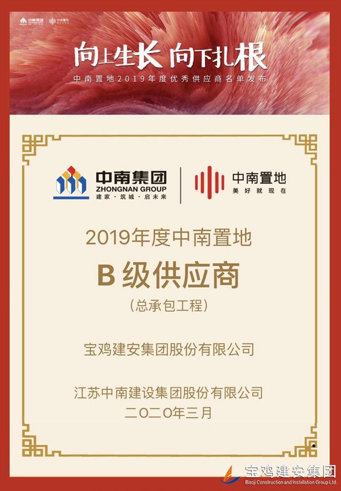 “中南置地2019年度優(yōu)秀供應(yīng)商”由中南置地設(shè)立,從全國100座城市360個標(biāo)桿項目中選出,A級供應(yīng)商8家,B級供應(yīng)商36家。寶雞建安集團(tuán)股份有限公司在360個標(biāo)桿項目中脫穎而出,成為陜西省唯一一家B級供應(yīng)商。