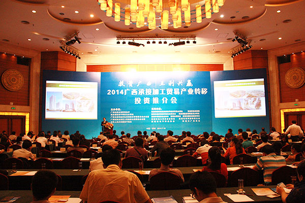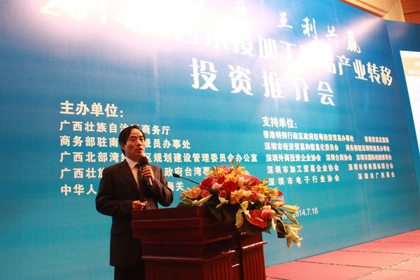 2014年7月16日,由自治區(qū)商務(wù)廳主辦的2014廣西承接加工貿(mào)易產(chǎn)業(yè)轉(zhuǎn)移投資推介會在深圳舉行。自治區(qū)政府副秘書長魏然,深圳市經(jīng)濟(jì)貿(mào)易和信息化委員會副主任高林等領(lǐng)導(dǎo)和嘉賓為會議致辭。自治區(qū)商務(wù)廳、北部灣辦分別從不同角度對廣西承接加工貿(mào)易產(chǎn)業(yè)轉(zhuǎn)移投資環(huán)境進(jìn)行了推介。北海、欽州、梧州、南寧四個(gè)國家級加工貿(mào)易梯度轉(zhuǎn)移重點(diǎn)承接地,欽州保稅港區(qū)、憑祥綜合保稅區(qū)、北海出口加工區(qū)、中馬欽州產(chǎn)業(yè)園、東興國家重點(diǎn)開發(fā)開放試驗(yàn)區(qū)、南寧高新技術(shù)產(chǎn)業(yè)開發(fā)區(qū)、中國電子北海產(chǎn)業(yè)園、梧州市粵桂合作特別實(shí)驗(yàn)區(qū)八個(gè)重點(diǎn)園區(qū),分別就各自的產(chǎn)業(yè)布局、投資環(huán)境、政策優(yōu)勢進(jìn)行了推介。香港特區(qū)政府駐粵辦、香港貿(mào)易發(fā)展局、深圳外商投資企業(yè)協(xié)會、深圳臺商協(xié)會、深圳市加工貿(mào)易企業(yè)協(xié)會、深圳市企業(yè)聯(lián)合會、深圳市電子行業(yè)協(xié)會及廣東各類加工貿(mào)易企業(yè)約400人出席了推介會。