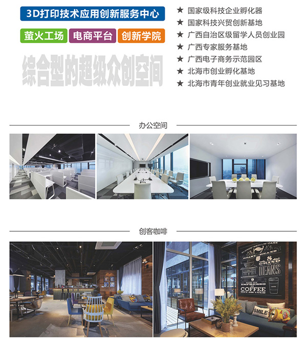 中電北海產(chǎn)業(yè)園眾創(chuàng)空間規(guī)劃面積5000平方米,重點(diǎn)圍繞智慧城市、智能硬件、物聯(lián)網(wǎng)、移動互聯(lián)網(wǎng)、大數(shù)據(jù)、電子商務(wù)等重點(diǎn)新型產(chǎn)業(yè)領(lǐng)域,采取互聯(lián)網(wǎng)+現(xiàn)場服務(wù)的模式,整合上下游資源,為入住企業(yè)和創(chuàng)業(yè)者提供政策咨詢、科研支持、人才引進(jìn)、電商培訓(xùn)、創(chuàng)業(yè)指導(dǎo)、融資對接等服務(wù),形成支持創(chuàng)新創(chuàng)業(yè)的生態(tài)圈。中電北海產(chǎn)業(yè)園眾創(chuàng)空間通過整合各方資源,已經(jīng)集成一批面向區(qū)域主導(dǎo)產(chǎn)業(yè)的前沿技術(shù),整合了戰(zhàn)略投資基金、天使基金和社會投資相結(jié)合的創(chuàng)新創(chuàng)業(yè)投資基金,建立了涵蓋科學(xué)家、創(chuàng)業(yè)企業(yè)家和企業(yè)運(yùn)營管理專家的創(chuàng)業(yè)導(dǎo)師團(tuán)隊(duì),聚集電商平臺、3D打印技術(shù)應(yīng)用創(chuàng)新服務(wù)中心、創(chuàng)新學(xué)院、螢火工場實(shí)驗(yàn)室等一體化服務(wù)機(jī)構(gòu)構(gòu)成綜合型的超級眾創(chuàng)空間。
